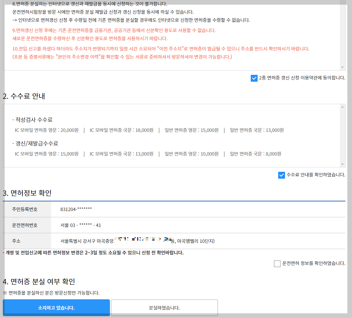 면허증을 분실하였을 경우엔 방문신청만 가능하니 참고해주시기 바랍니다.
