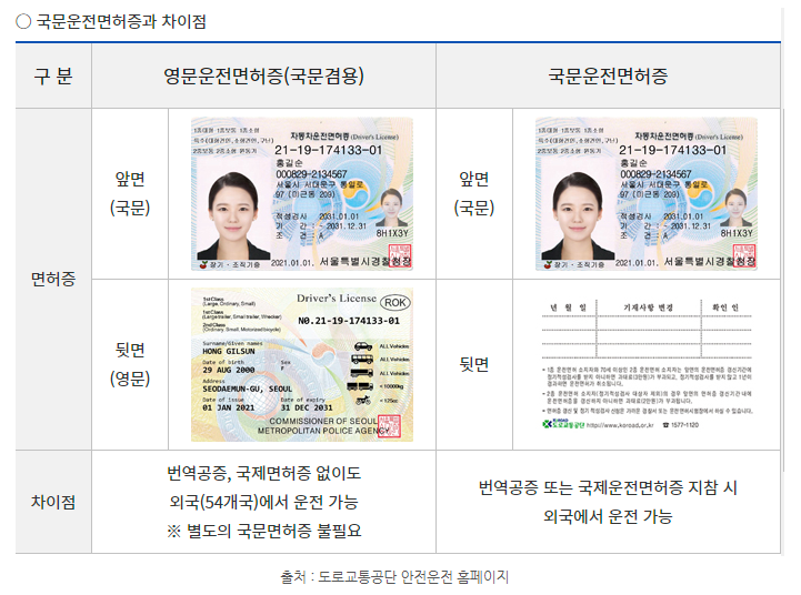영문운전면허증과 국문운전면허증의 차이점입니다. 영문은 번역공증, 국제면허증이 없어도 외국(54개국)에서 운전이 가능하고 국문은 번역공증 또는 국제운전면허증을 지참해야 외국에서 운전이 가능합니다.