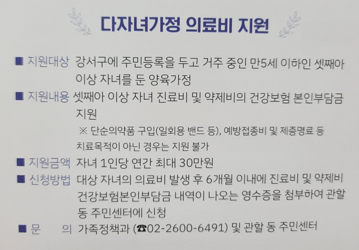 안녕하세요. 강서구에는 다자녀 가족을 위한 지원을 많이 해주는데요. 그중에서도 셋째자이 이상 자녀의 진료비랑 약제비를 지원해 주는 제도가 있어서 소개해 드리려고 해요.