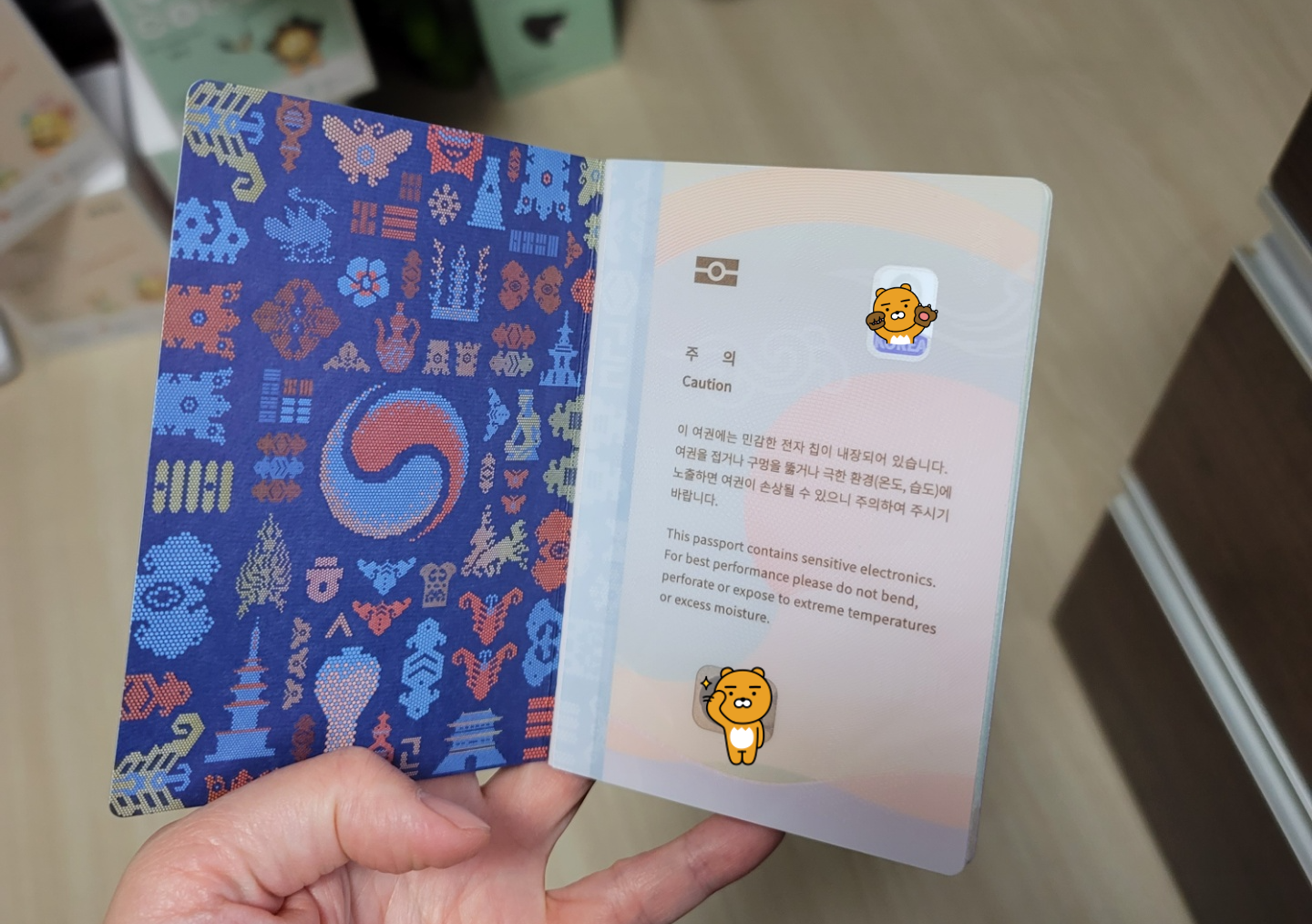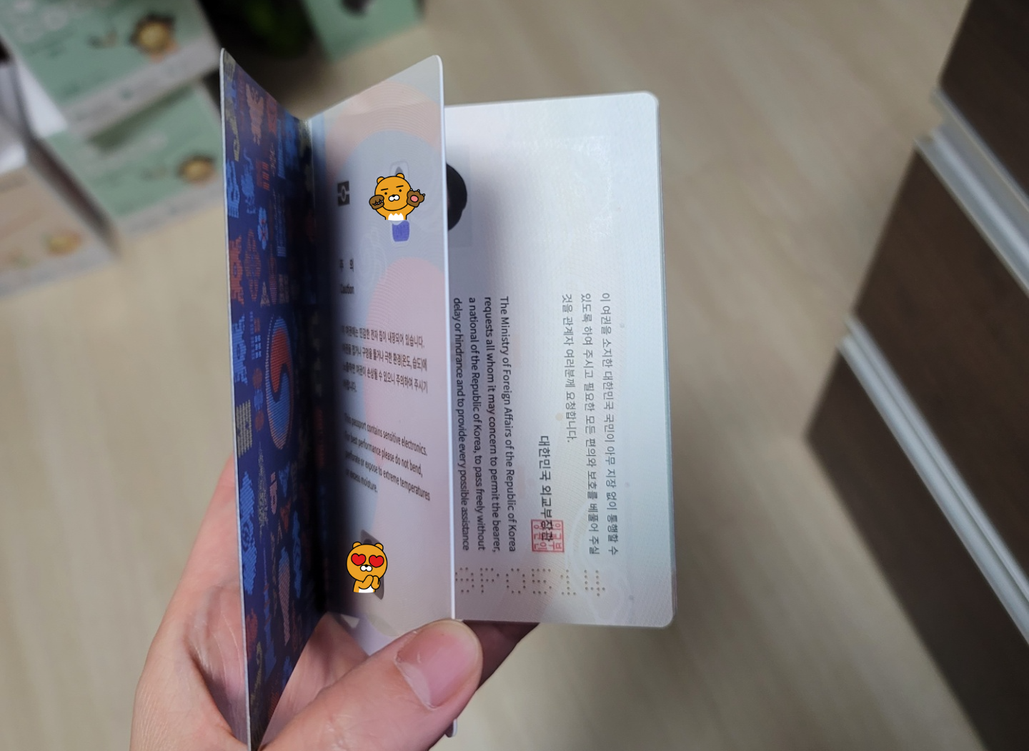 차세대 전자여권 첫장이에요. 기존 여권은 모든 면이 종이로 되어져 있는 반면에 전자여권의 첫장은 꽤 두꺼운 플라스틱 재질로 되어 있어요. 라이언 이미지로 가려진 부분에는 여권사진이 작게 들어가져 있는데요. 주민등록 처럼 보이는 각도에 따라서 사진과 생년월일이 보이고 안보이고 하더라구요.