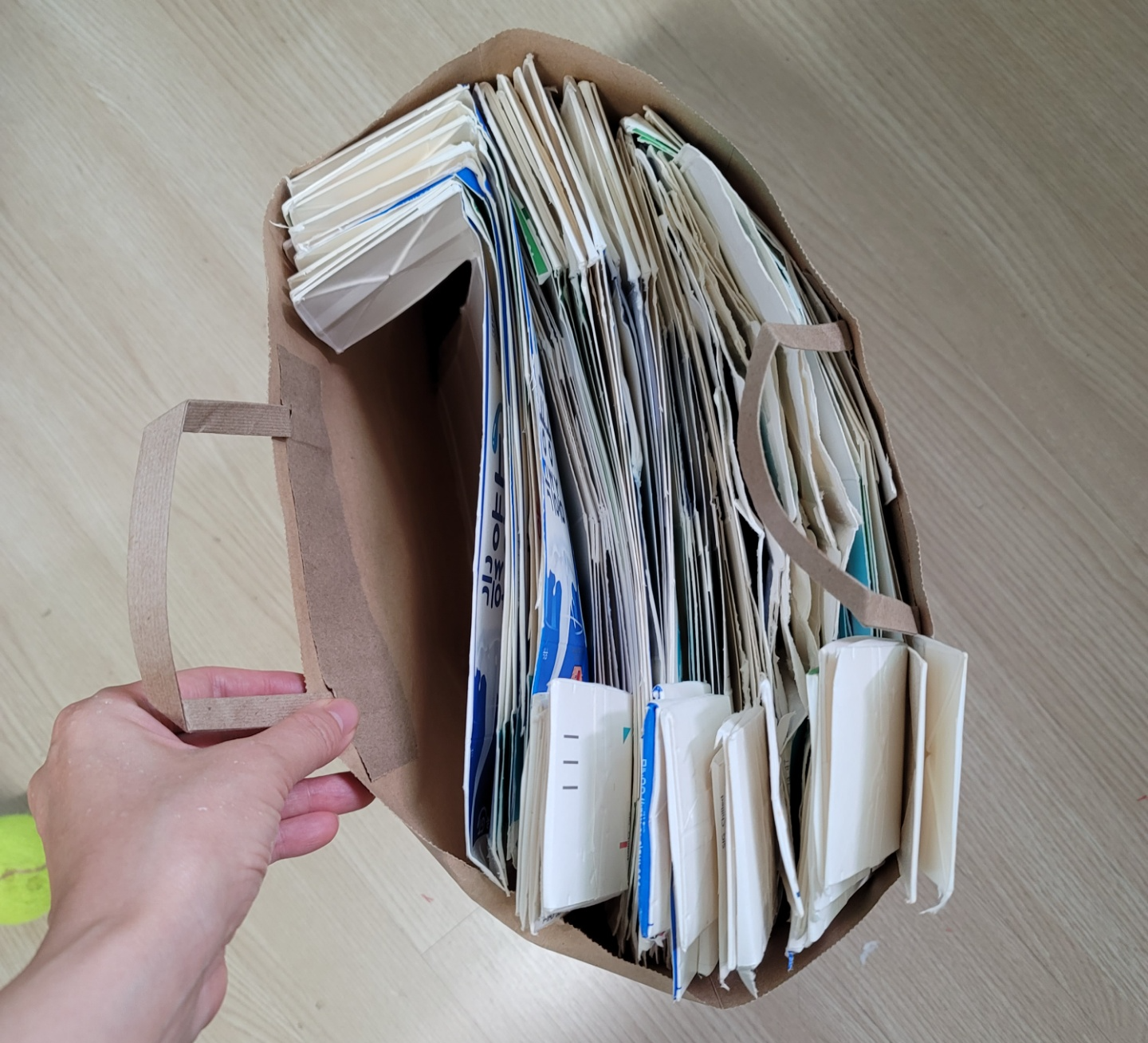 우유팩 이만큼이 2kg 이에요. 이렇게 모인 우유팩을 종이가방에 차곡차곡 담아서 주민센터로 가지고 갑니다. 대형폐기물 스티커 발급해주시는 곳에 가서 우유팩 교환하러 왔다고 이야기 하니 바로 무게 달아보시고 수령 확인한다는 명부 작성하고 휴지 2롤을 챙겨주셨어요.