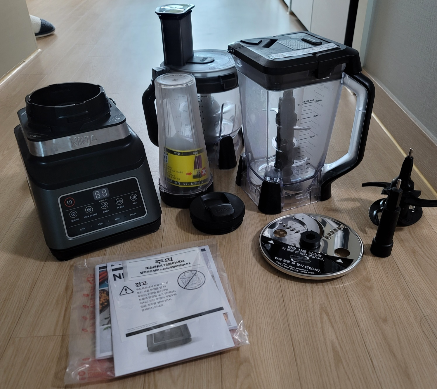 제품 본체와 싱글컵, 푸드프로세서, 피처 컨테이너와 칼날들이 있습니다.