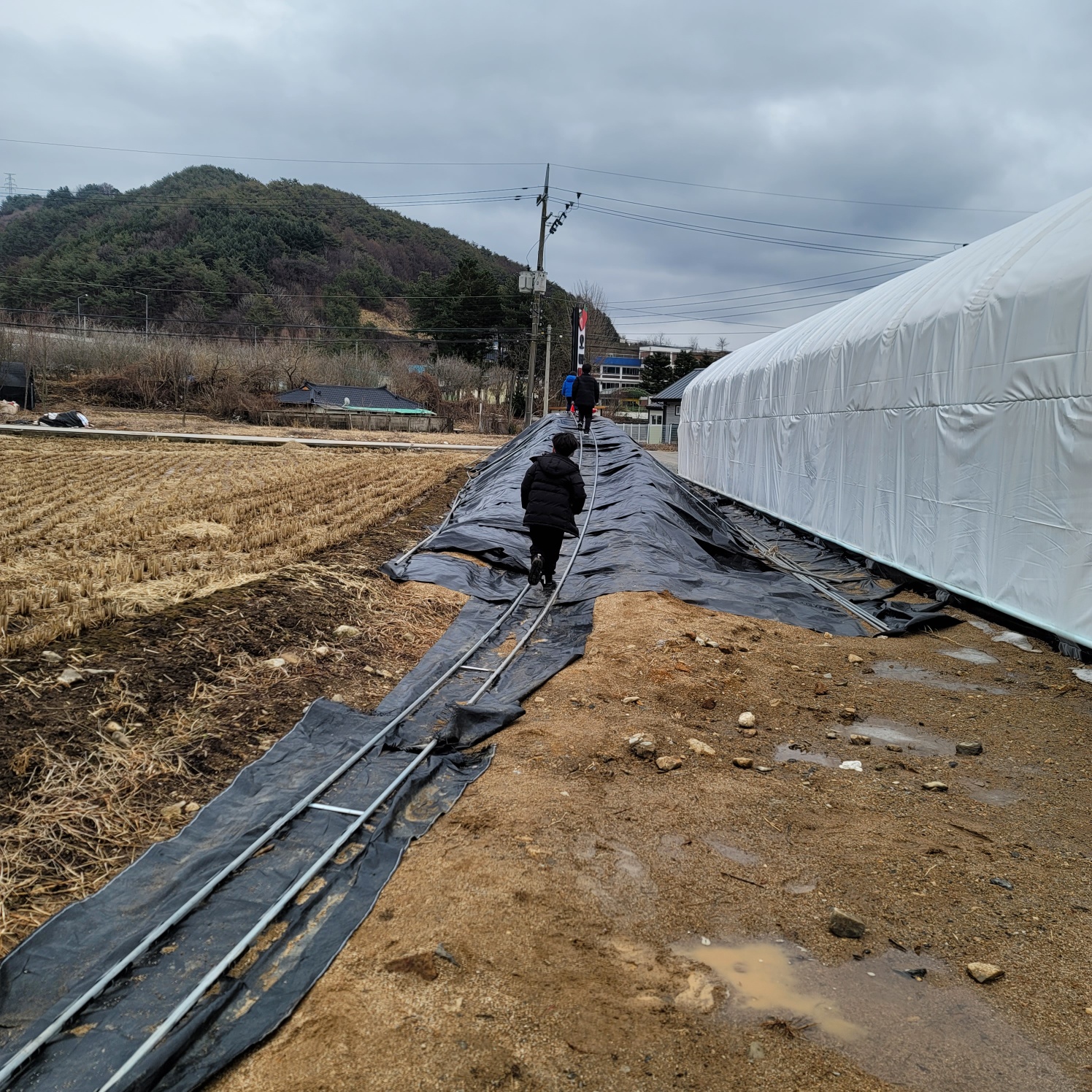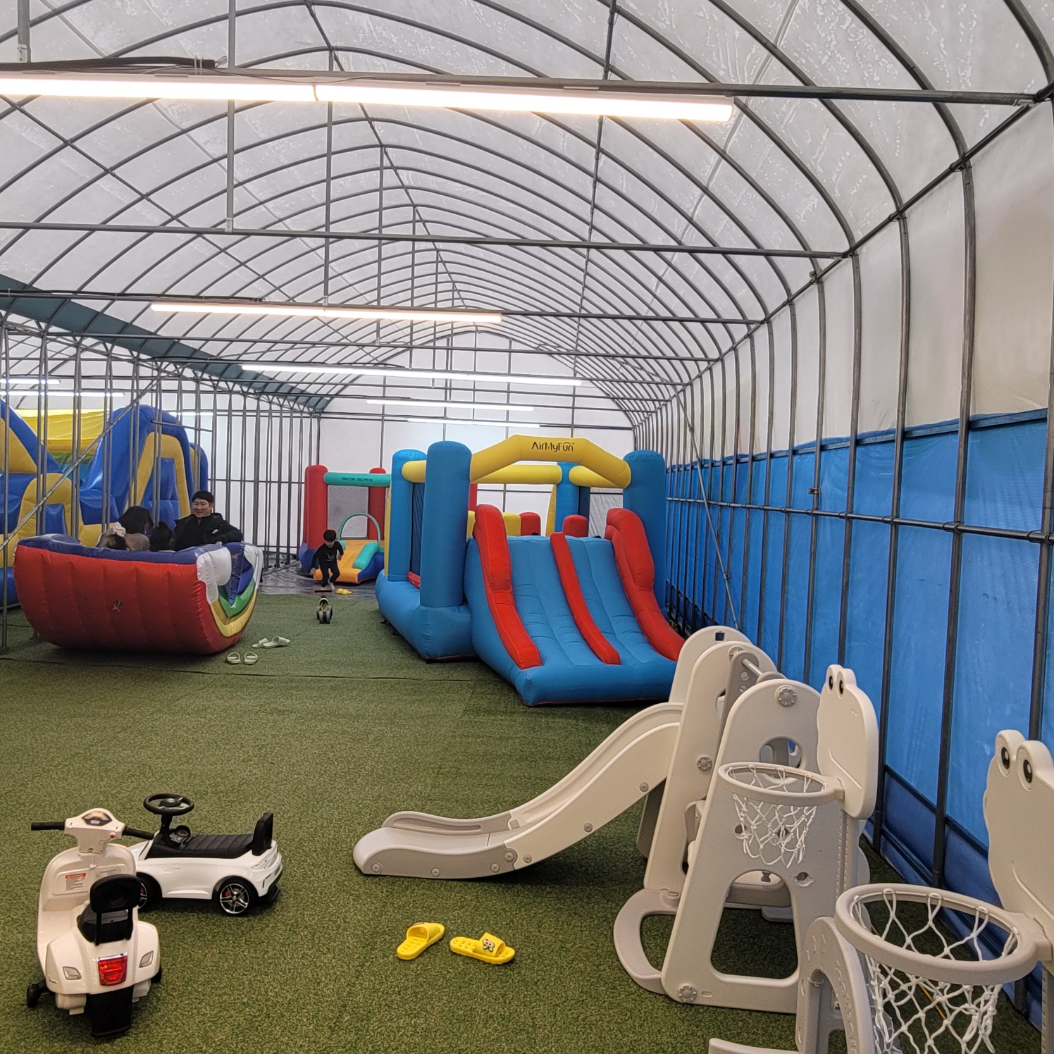우측에 보이는 비닐하우스가 놀이동이에요. 뒤쏙으로 오면 이렇게 썰매를 탈 수 있는 곳이 있어요.